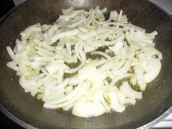 En la misma sartén con un poco más de aceite pochamos la cebolla cortada en juliana, añadimos sal