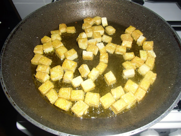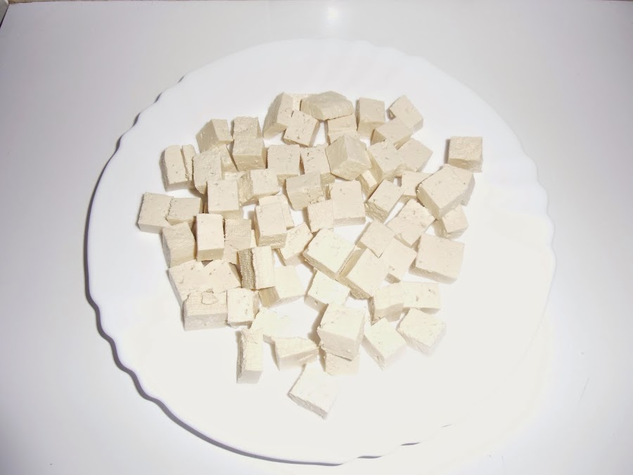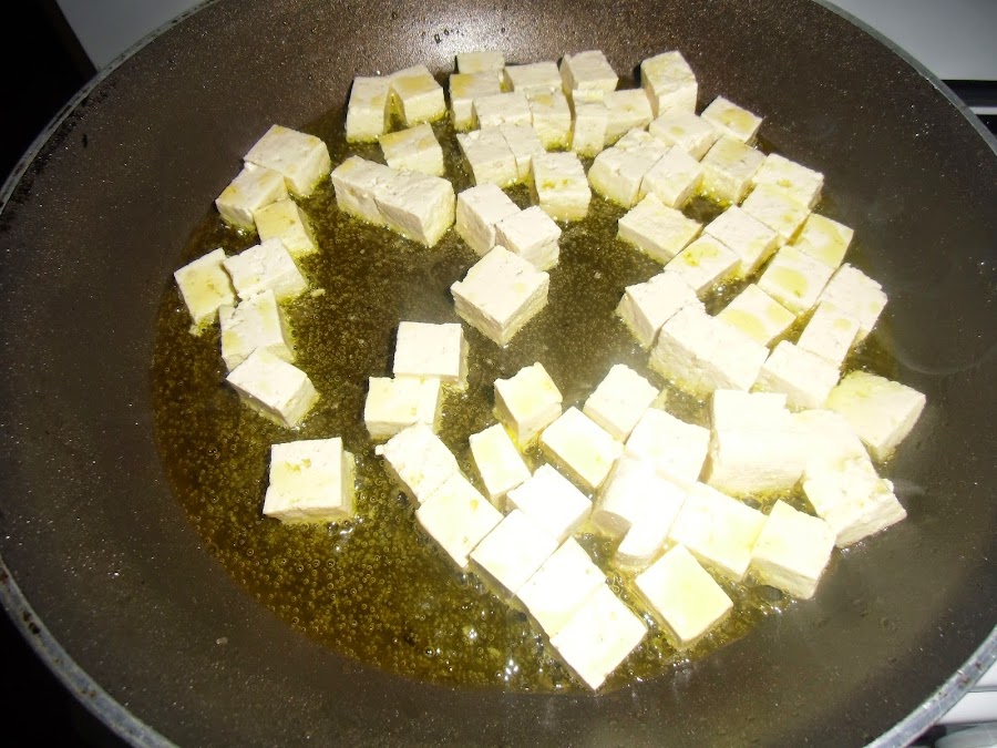 Cortamos el tofu a dados y lo salteamos en una sartén con unas gotas de aceite de oliva.