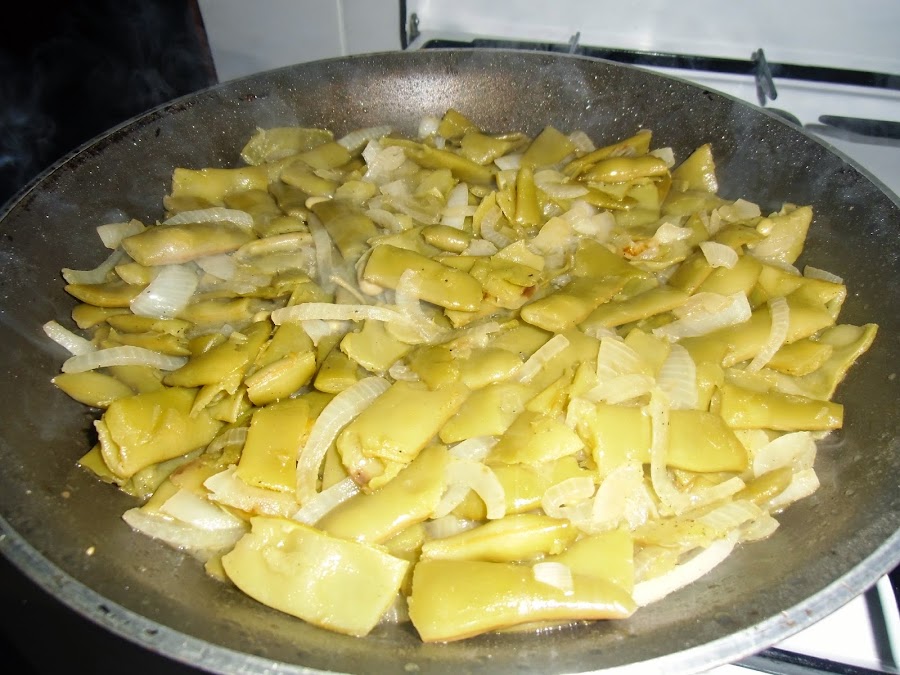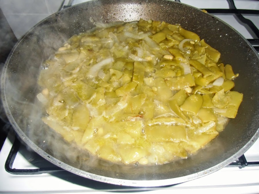 En cuanto la cebolla esté pochada añadimos las judías verdes y un poco de pimienta negra