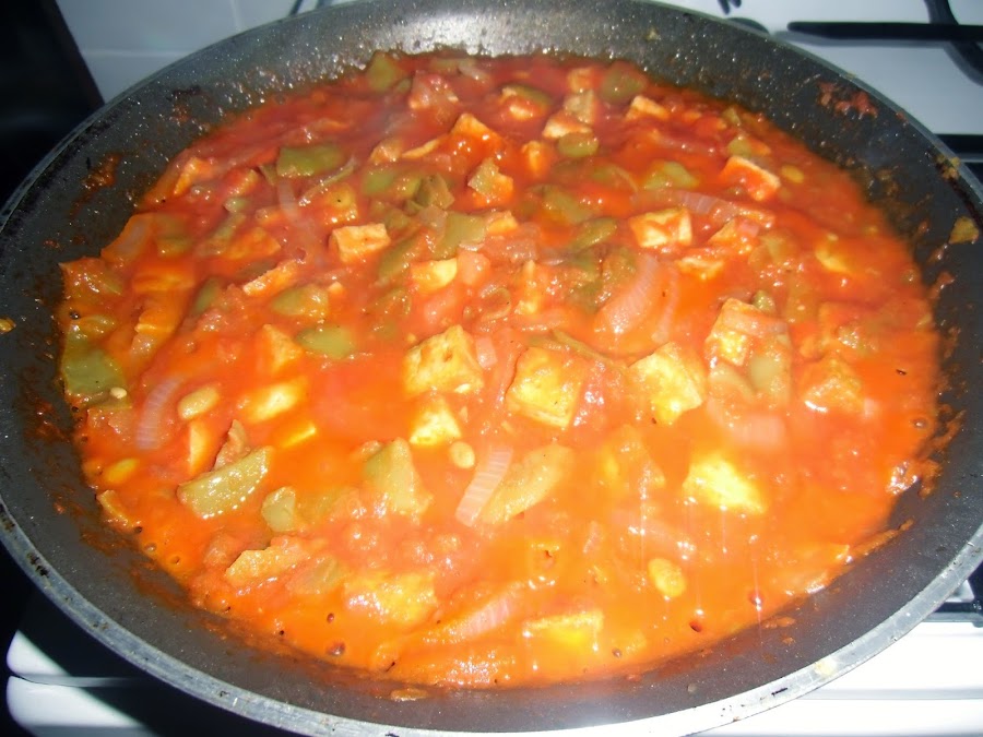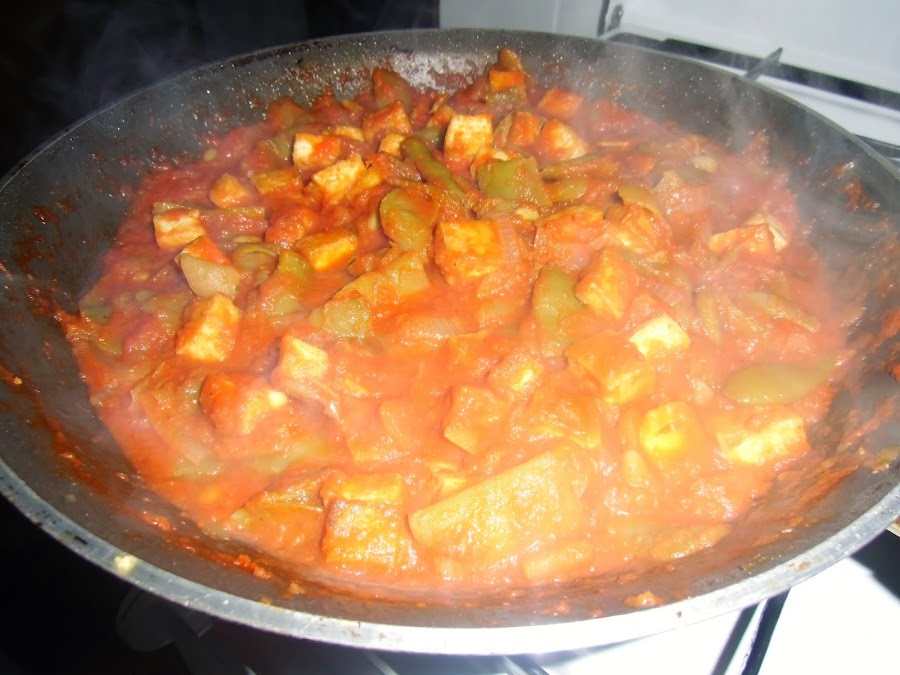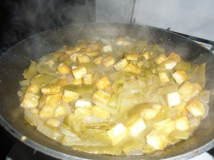 Cuando el vino reduzca añadimos el tofu y cocinamos un par de minutos