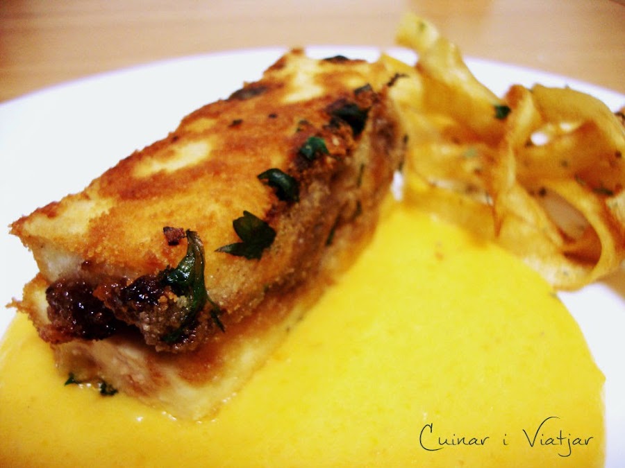 Esta receta consta de tres elaboraciones distintas. En primer lugar tenemos la crema de zanahoria, en segundo lugar el empanado de tofu y por último los tallarines fritos.
