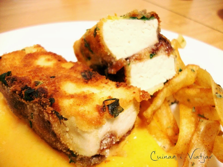 En primer lugar, envolvemos el tofu en papel absorbente de cocina y presionamos para eliminar el exceso de agua que contiene. A continuación, lo cortamos en rodajas de 2-3 cm de grosor y añadimos la mermelada de fresa y chili. Lo cerramos con otro trozo de tofu y empanamos. Para el empanado seguiremos los siguientes pasos: 1 vez por harina, 1 vez por huevo batido, 1 vez por pan rallado con ajo y perejil troceado. En una sartén con aceite de oliva freímos a fuego medio para que no se queme.