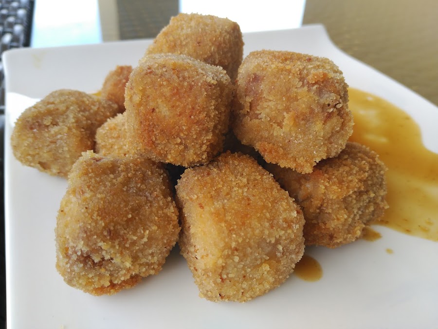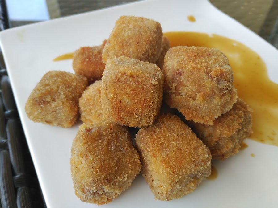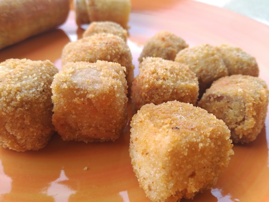- Escurrimos el tofu y lo pasamos por harina, huevo batido y pan rallado, y lo freímos en abundante aceite bien caliente, unos minutos, solo hasta que se dore.
