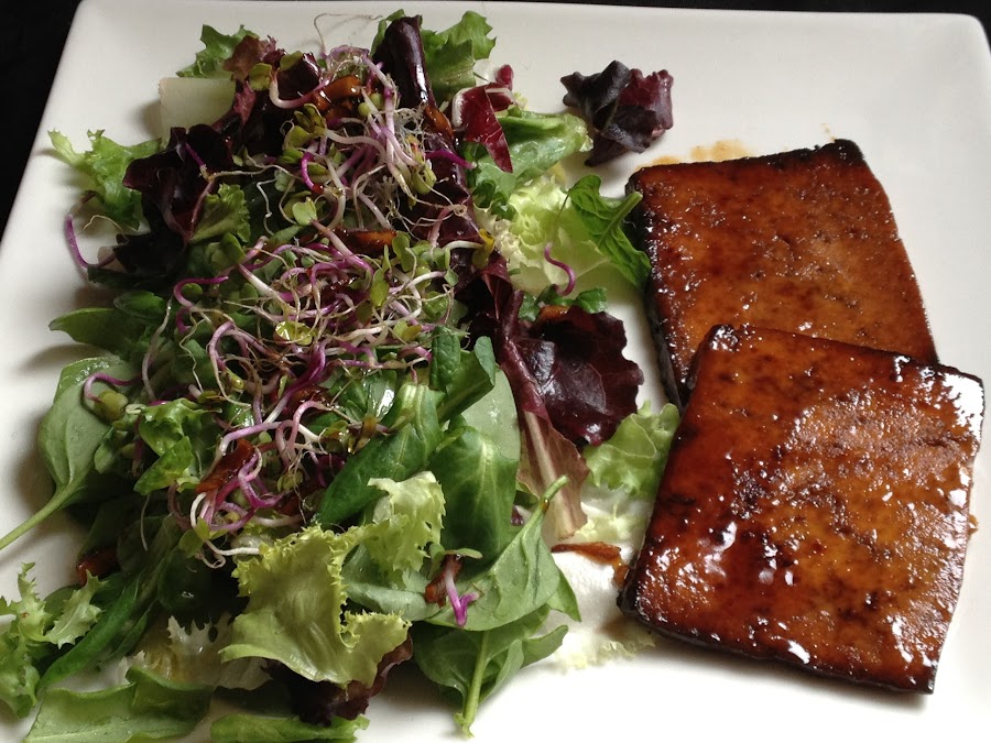 Hervir el tofu durante 5 minutos con un poco de shoyu. Entonces, cortar el jengibre, en trozos finos y reservar. A continuación, cortar el tofu. Freír lo en aceite bien caliente por los dos lados para que quede igual de hecho.En una sartén mezclar bien el concentrado de manzana ( o una cucharada sopera de miel) y cinco cucharadas de agua. Añadir el tofu y el jengibre. Hacer hervir durante 3 minutos, reducir el fuego al mínimo y dar vueltas al tofu hasta qué absorba todo el líquido.