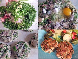 1. Tritura la cebolleta y la zanahoria. Agrega el pollo, el tofu, el huevo, el pan rallado, la harina, la sal y pimienta. Pica todo hasta que se mezcle bien.