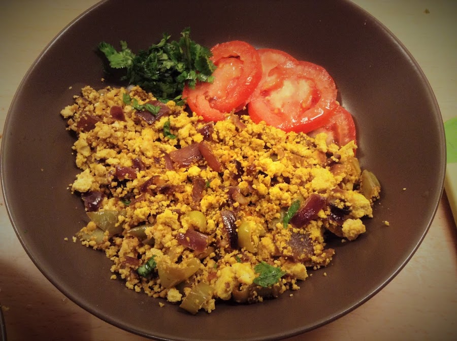 1.Vamos a preparar el tofu que hará las veces del huevo. Ponlo en un plato, desmenúzalo hasta que parezca un revuelto. Agrega media cucharadita de cúrcuma, un poco de pimienta y una cucharada sopera de Tamari (si no tienes pues pon un poquito de sal).