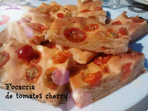 Y, ¿por qué la he llamado tomaccia? fácil: cuando le dije al cachorrito pequeño (mi sobri) que este pan se llamaba focaccia, él, al verlo lleno de tomates por encima dijo "está buena la tomaccia". Y con tomaccia se quedó :)