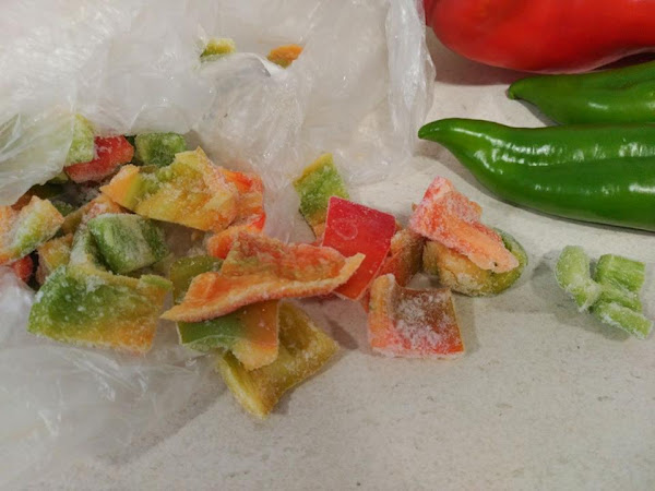 Para la receta he aprovechado unos pimientos que congele este pasado verano cuándo tenía exceso de producción.Digo exceso de producción,no porqué me haya a puesto a cultivar,que todo se andará,sino porqué tengo una familia muy generosa y siempre nos traen de todo lo que recogen de la huerta y eso es mucho de agradecer..
