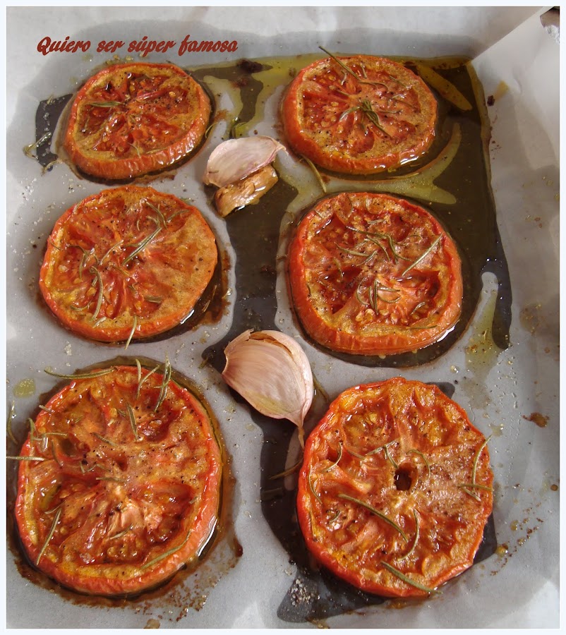 Lavar y secar bien los tomates. Cortar a rodajas algo gruesas y colocar en una bandeja para horno, sobre papel sulfurizado.