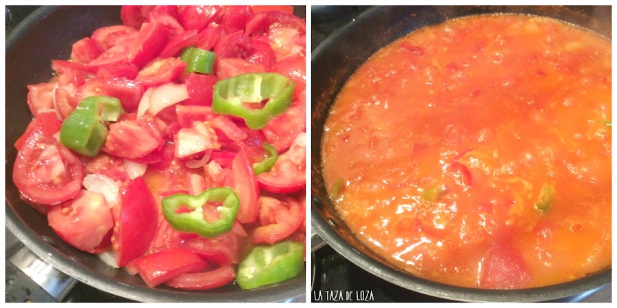 Se le da unas vueltas y se agrega la sal. El fuego debe estar medio, hasta que ya se ve como la imagen de la derecha (de la cocción) y se baja para que se vaya evaporando el líquido poco a poco.