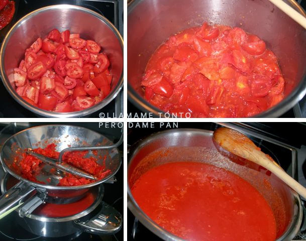 Hay quién los escalda primero y los pela, pero a mi modo de ver, ese paso nos lo podemos ahorrar, ya que luego los trituraremos con el pasapurés y eliminaremos la piel y las semillas.