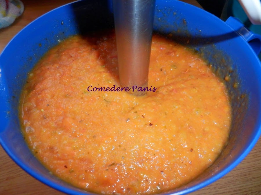 Cuando tengas molida la salsa con la batidora si prefieres una salsa más fina puedes pasarla por un pasa puré y de ese modo eliminar la piel del tomate.