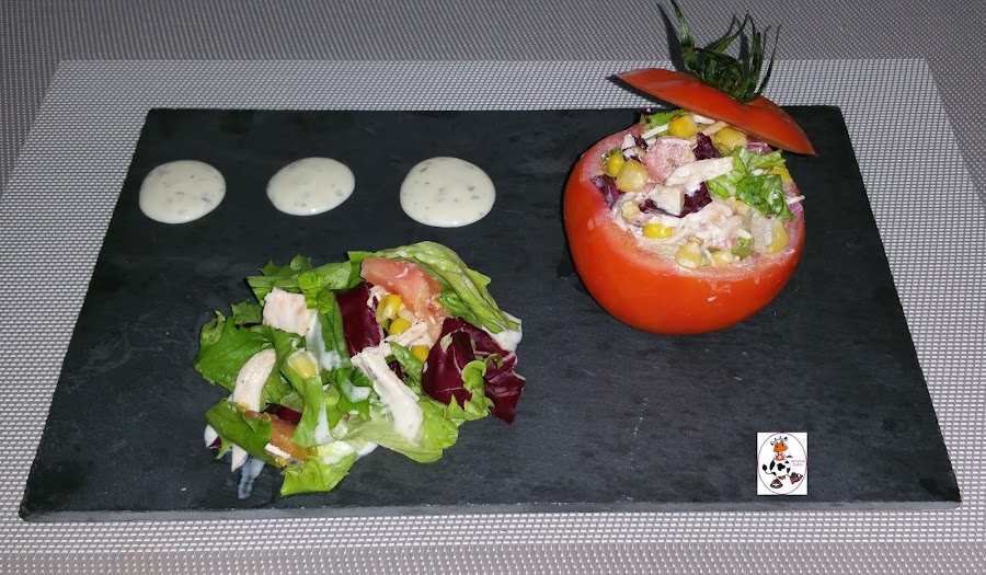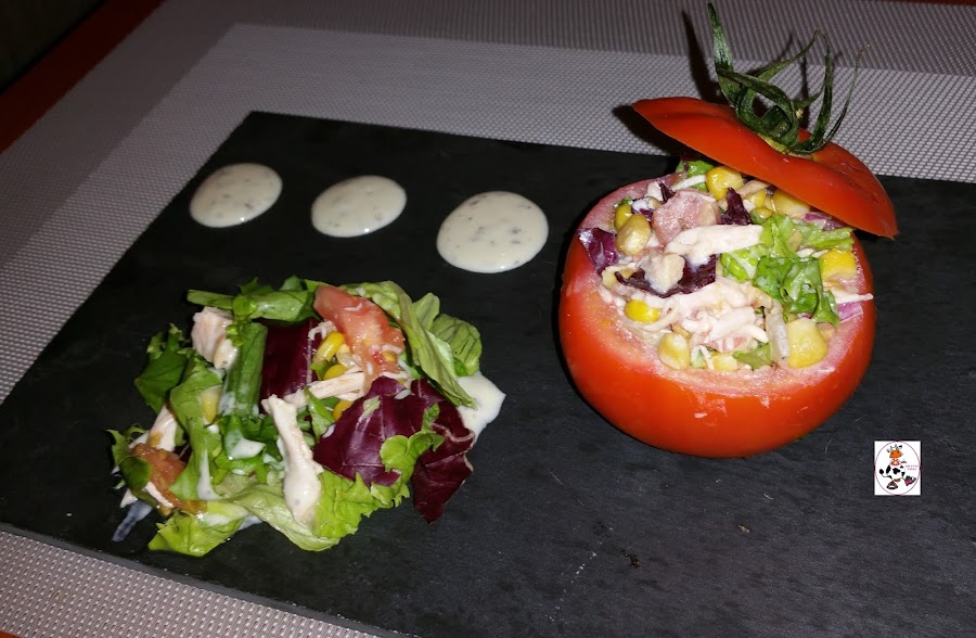 Yo puse al lado del tomate un poco de ensalada con tomate, pollo, millo (maiz dulce) y la salsa de yogur.