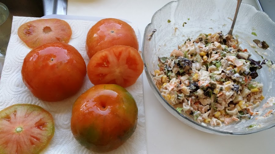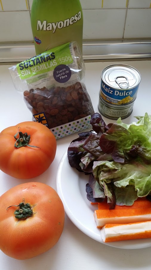 A continuación, mezclamos todos los ingredientes junto con el interior del tomate. Si queda mucha agua, mejor escurrirlo un poco antes de mezclar todo lo demás.