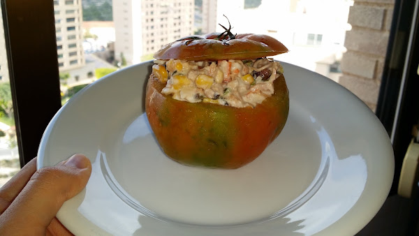 Rellenamos los tomates con una cuchara y ya lo tendríamos listo. Como mejor está es bien frío.