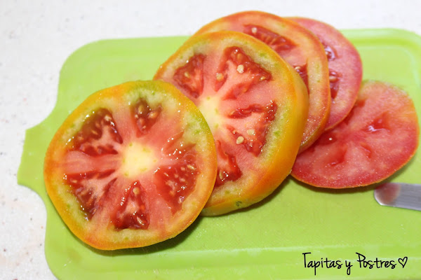 Lavamos y cortamos en rodajas los tomates. No hay que decir que el éxito de la receta es la calidad del tomate. Los salpimentamos.