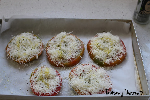 Lavamos los tomates y los cortamos en rodajas gruesas, salpimentamos por las dos caras y colocamos en una fuente de horno con papel vegetal. Cubrimos cada rodaja con queso parmesano rallado al momento (si es posible). Espolvoreamos un poquito de perejil picado y añadimos unas gotas de aceite. Horneamos a 180º unos quince minutos, hasta que el queso se funda. Servimos calientes.