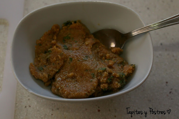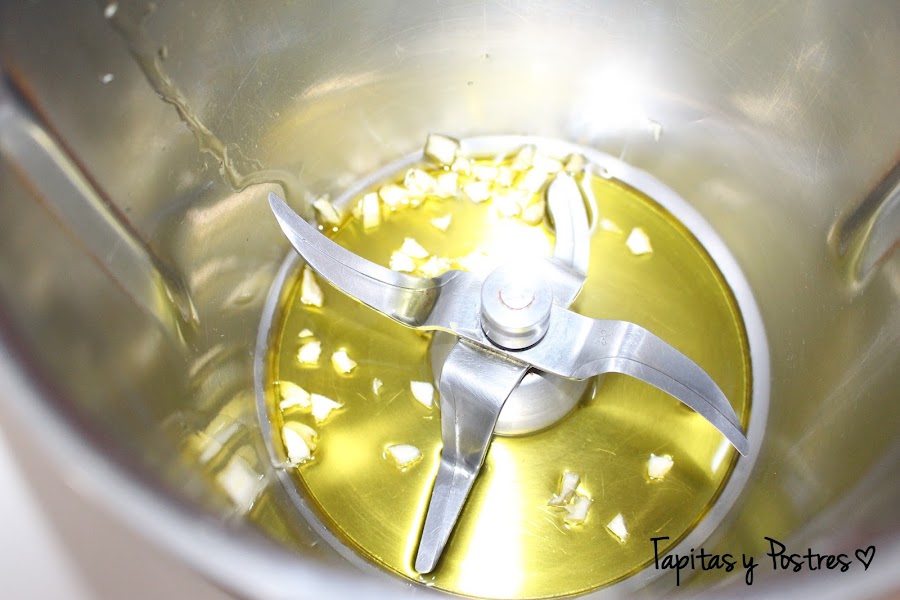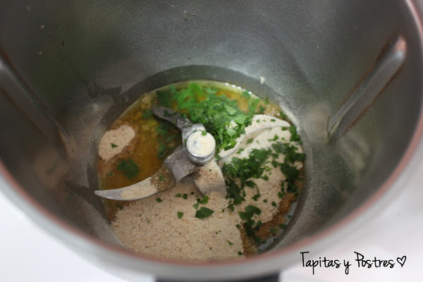 En el vaso de la thermomix ponemos el aceite y el ajo picadito. Programamos 2 minutos, temperatura Varoma y velocidad 1. Al acabar añadimos la sal, el pan rallado y el perejil picadito, programamos 1 minuto, Varoma y velocidad 1. Ya está el relleno.