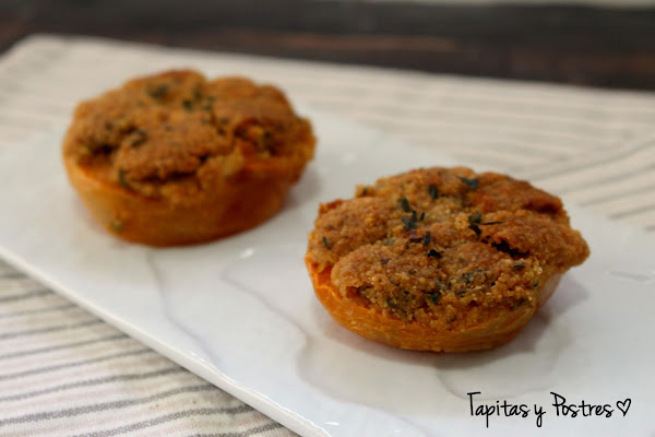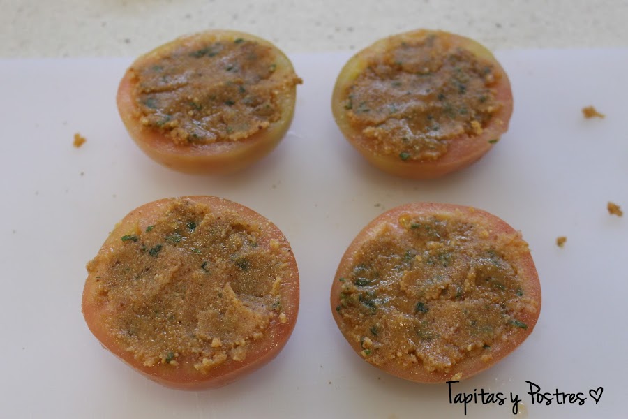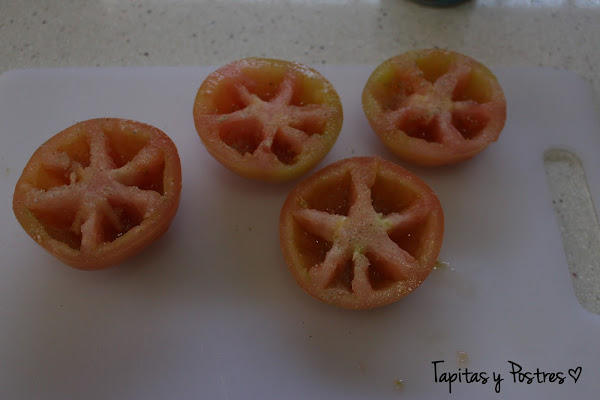 Lavamos y cortamos por la mitad los tomates, le vaciamos con cuidado las pepitas y salpimentamos. Rellenamos con la masa que hemos preparado en la thermomix y horneamos a 180º con calor arriba y abajo durante unos 30 minutos.