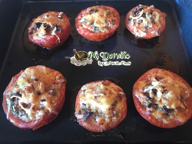 Vamos rellenando los tomates que habremos puesto en una bandeja de horno, le ponemos la cebolla frita.