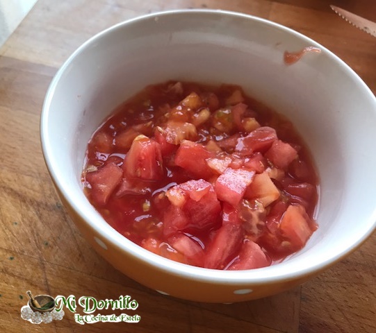 El líquido que suelta también lo utilizaremos. por lo que lo pondremos en un cuenco, con la carne de tomate picadita pequeña.