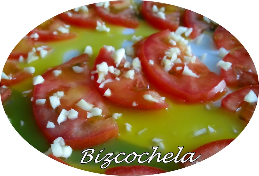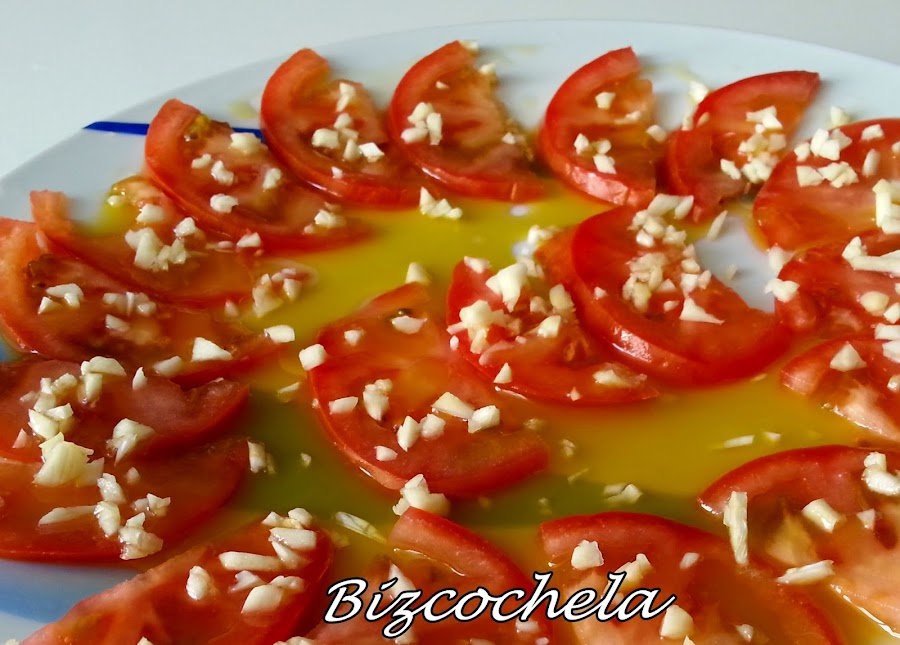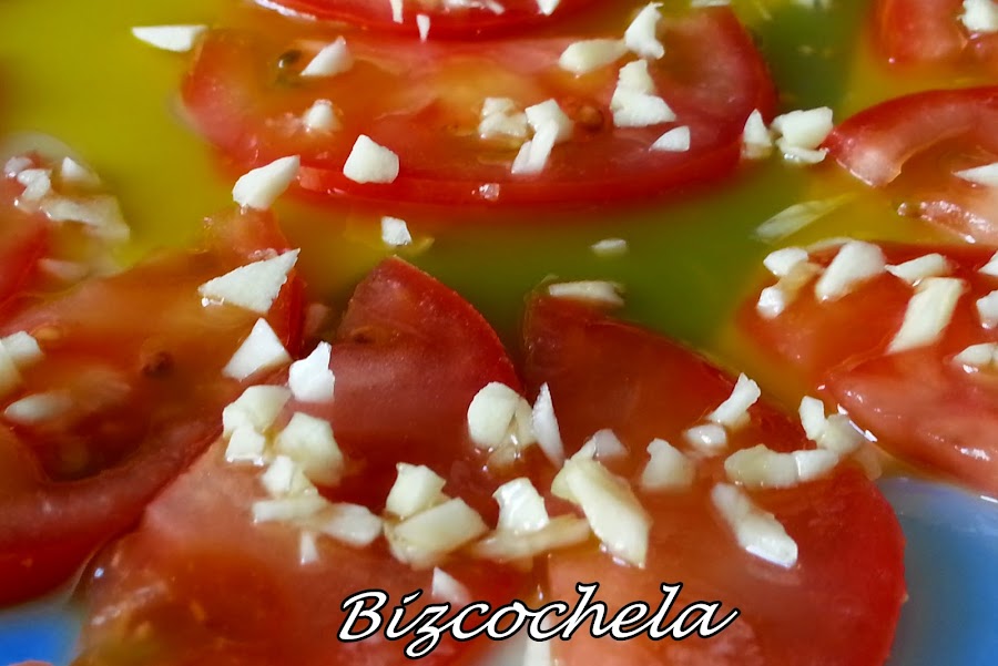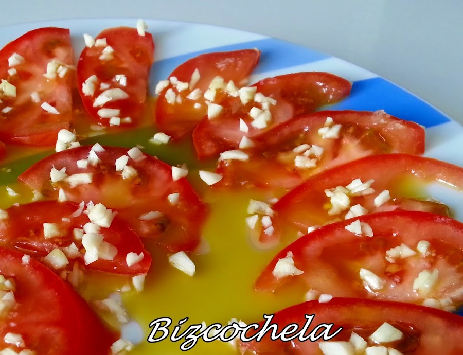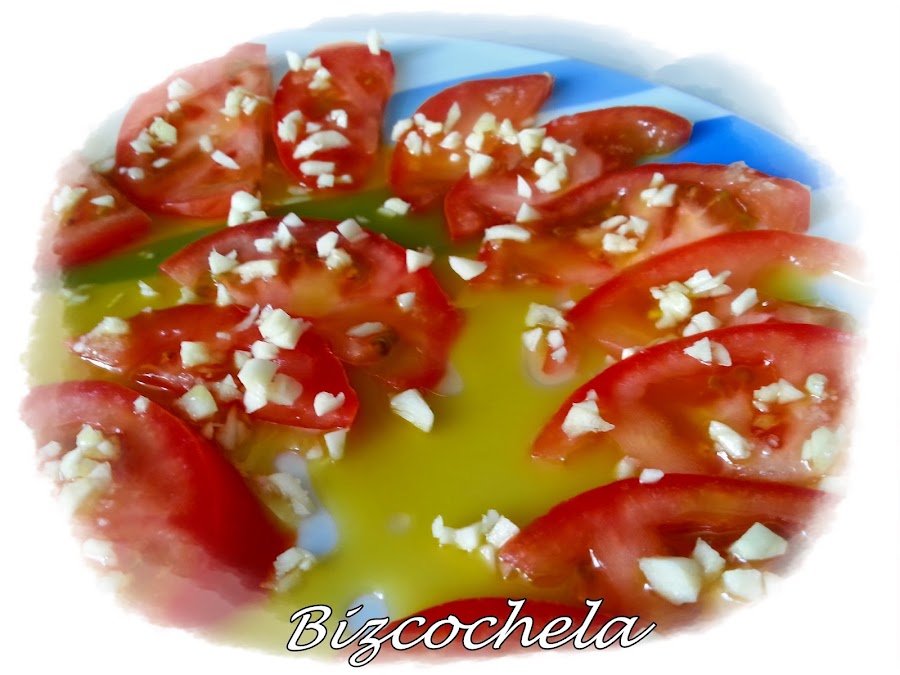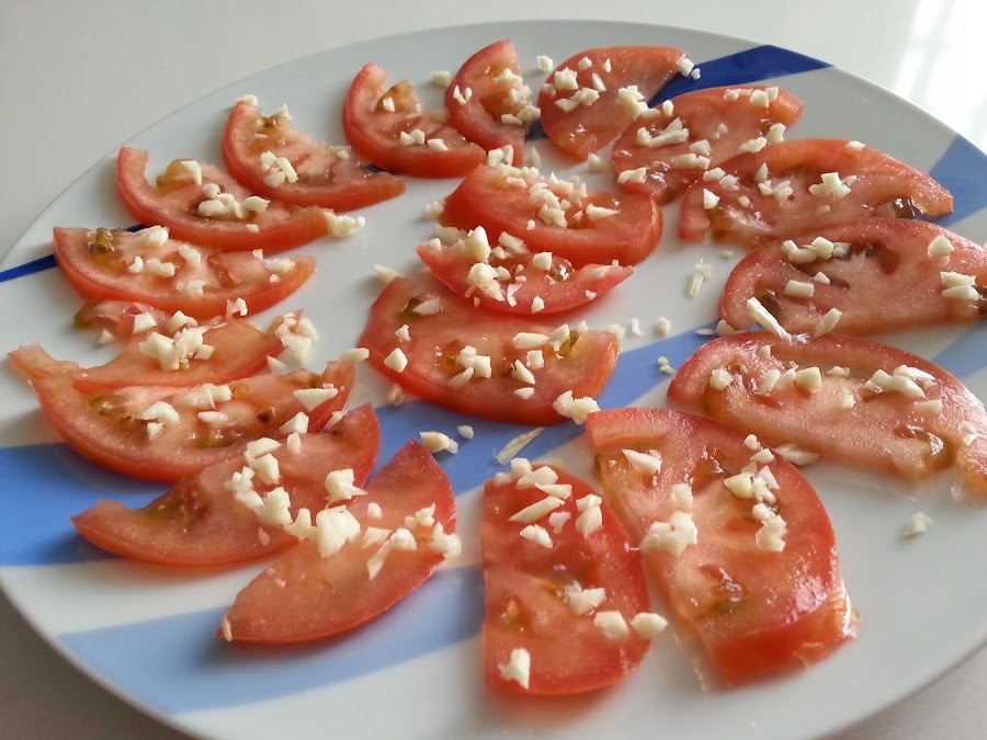 Y en esta ocasión propongo unos buenos tomates aliñados con ajo, son una delicia.
