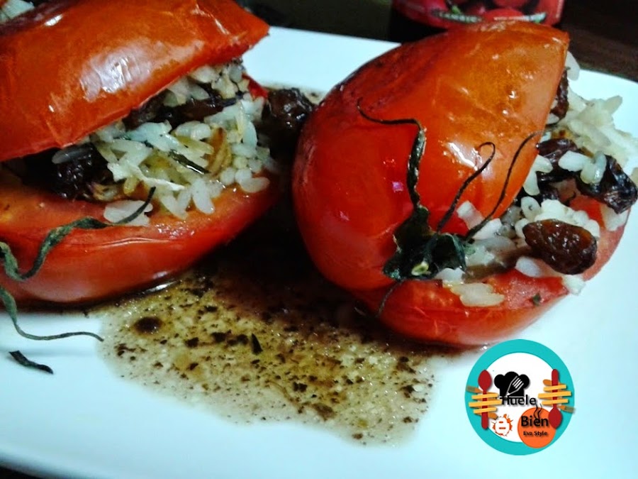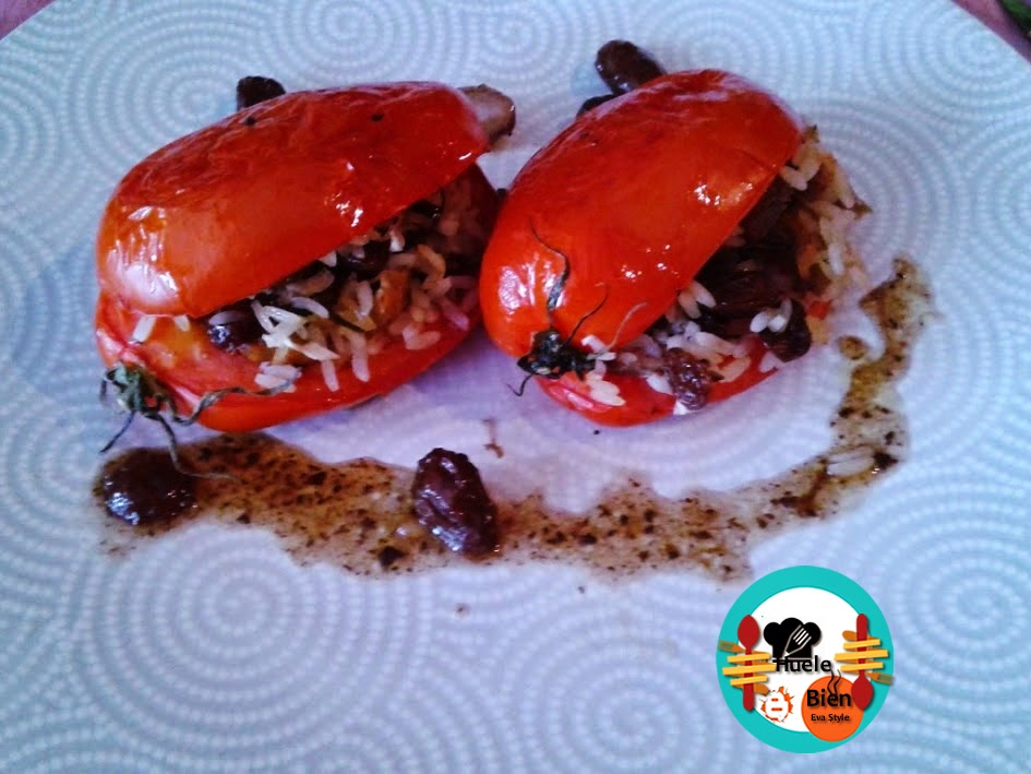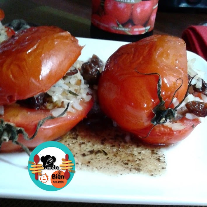 3.- Desmenuzamos la carne del conejo. Picamos la cebolla y las hierbas aromáticas, la mezclamos con el arroz, también la carne de conejo. Añadimos las pasas. Salpimentamos al gusto. Rellenamos los tomates. Rociamos con un poco de aceite de oliva.. Precalentamos el honor a 190º C y cocinamos los tomates 20 minutos.