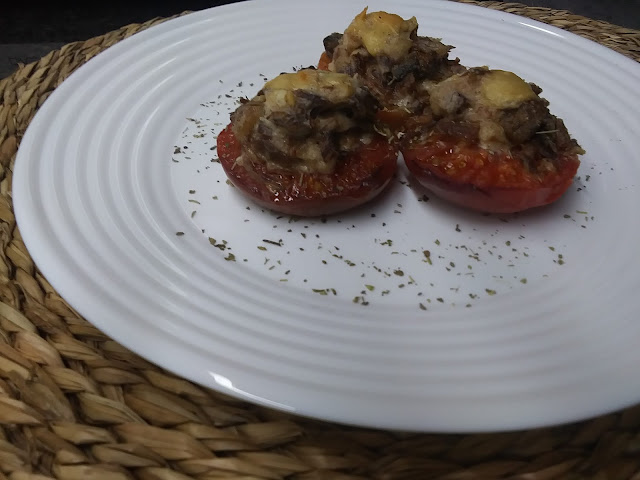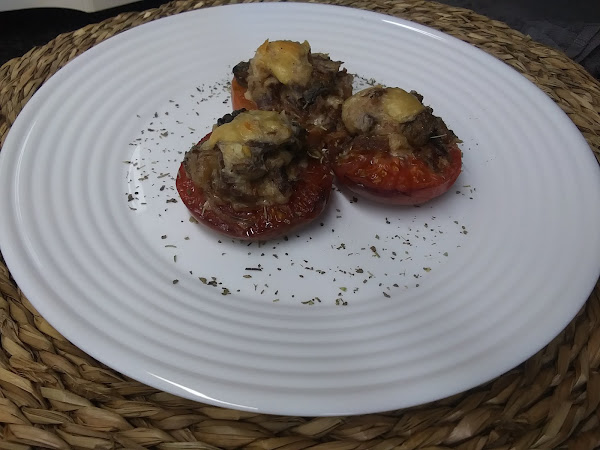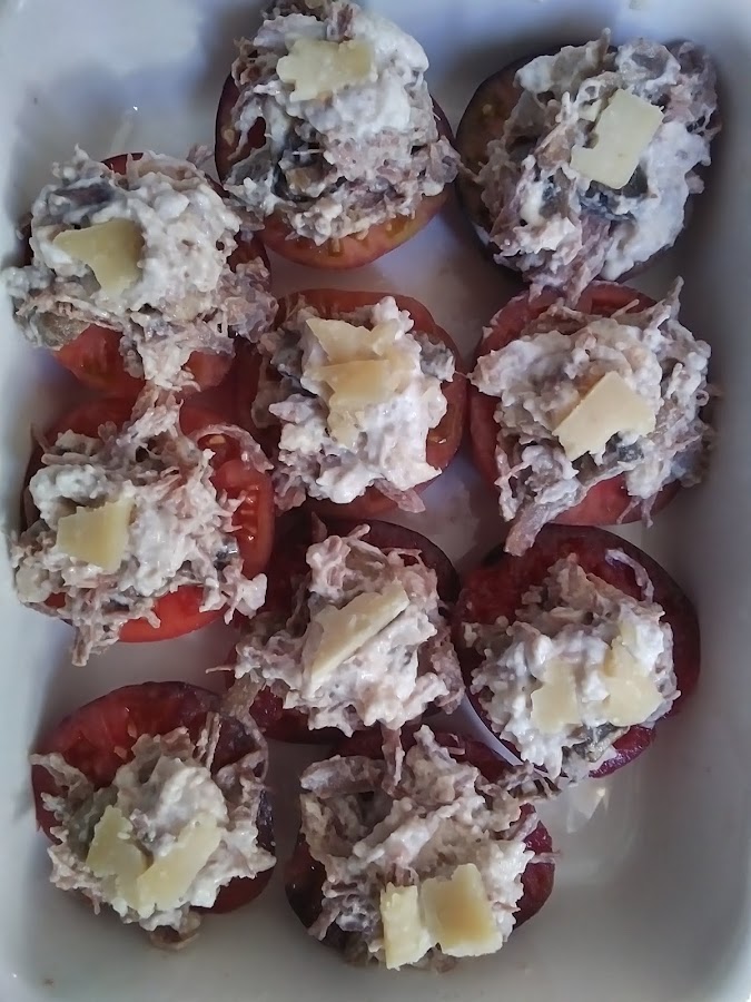 Esta receta es 100% de aprovechamiento. Por un lado los tomates azules, que encontré en Alcampo, estaban madurando rápidamente y tenía que darles salida. Por otro, la ternera del puchero, unos pocos champiñones salteados y un poco de bechamel que me sobraron de otras recetas. El resultado unos tomates gratinados, ideales para tunearlos con lo que os ronde por la nevera.