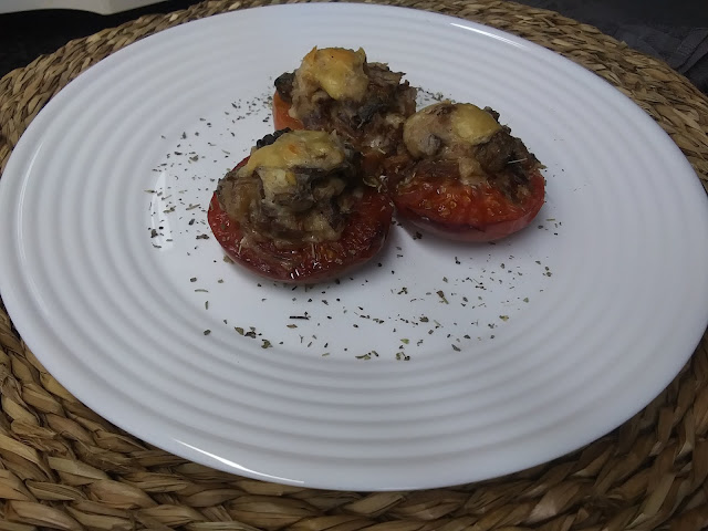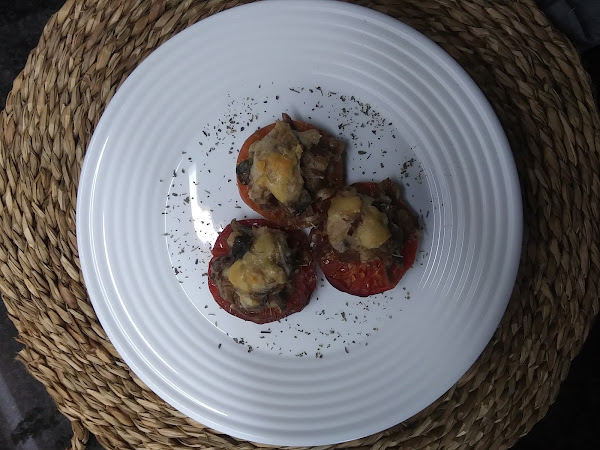 Ponemos un montoncito de la mezcla y un poco de queso a cada tomate. Horneamos a 250º calor arriba y abajo hasta que estén gratinados. Espolvoreamos con las hierbas provenzales.