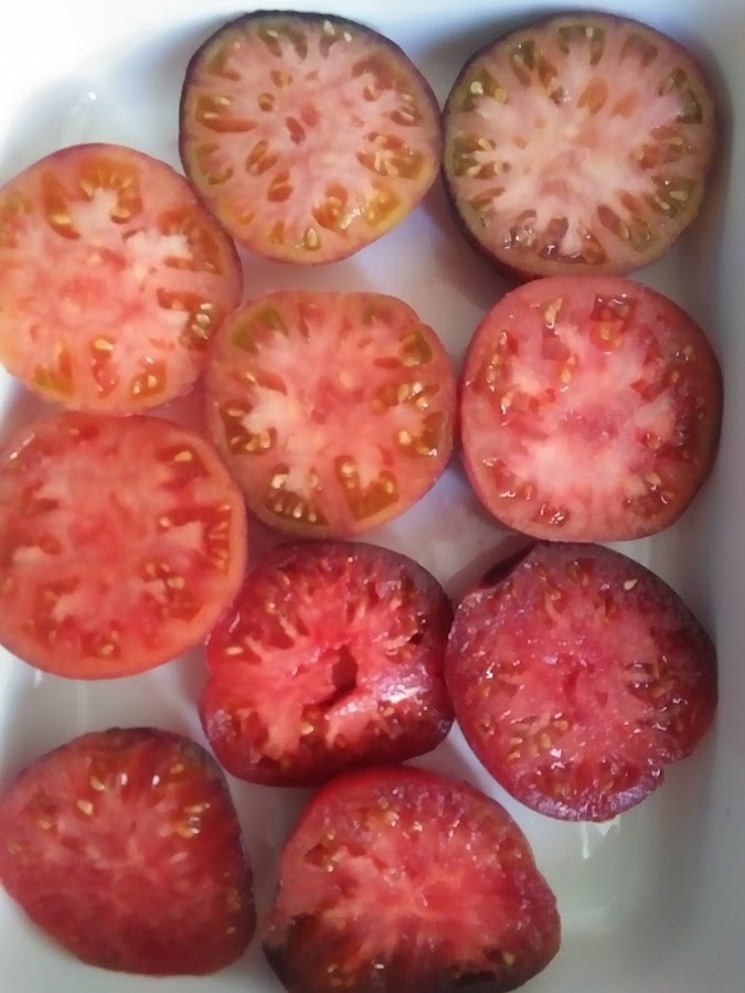 Quitamos el pedúnculo central a los tomates y los partimos por la mitad horizontalmente. Los disponemos en una fuente de horno. Salamos.
