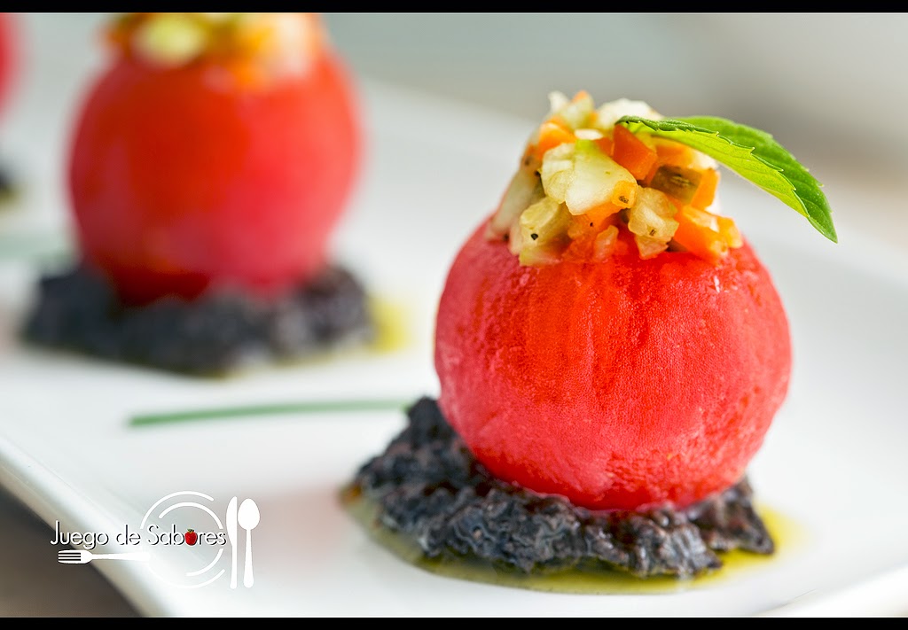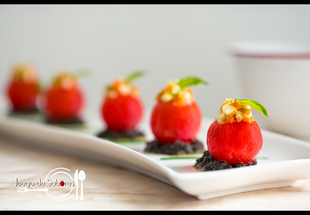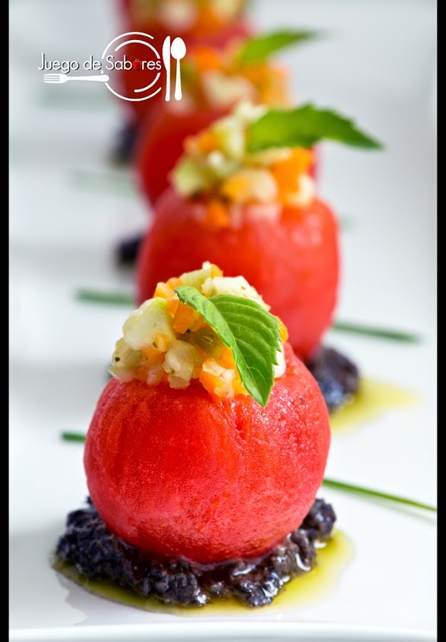Rellenar los tomatitos con la farsa reservada y poner sobre una base de tapenade (olivada), que puede ser casera o bien comprada.