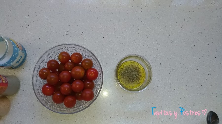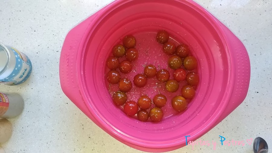 Colocamos los tomatitos en un recipiente de microondas y mezclamos con las especias. Lo cocinamos dos minutos.