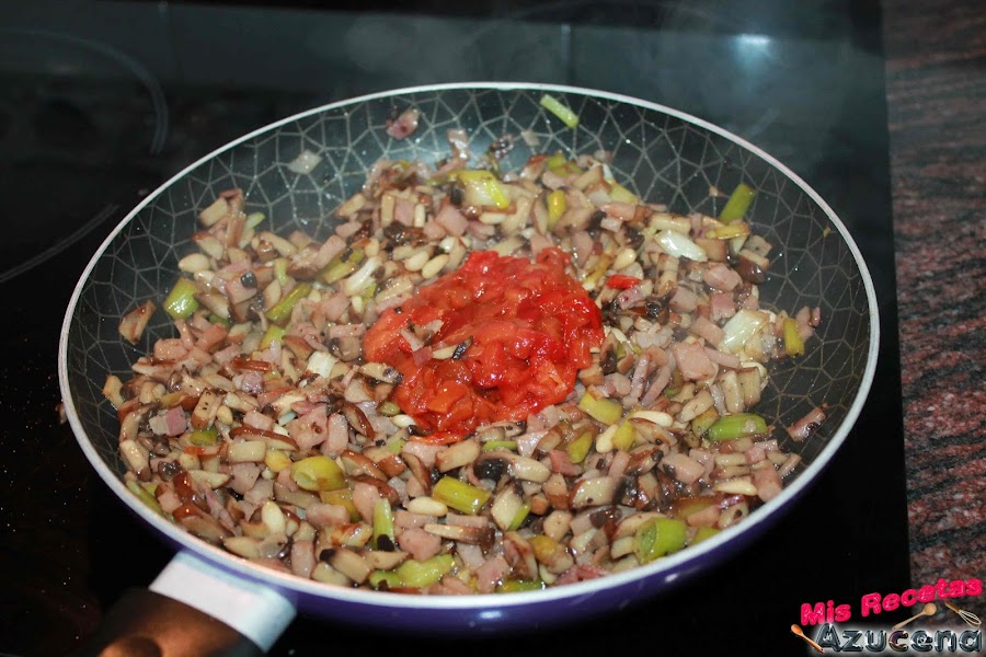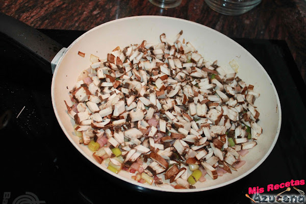 Transcurridos los 2 minutos por el beicon añadiremos el jamón york, lo dejaremos durante 4 minutos más para añadir las setas, estas las sofreiremos hasta que pierdan el agua que suelten.
