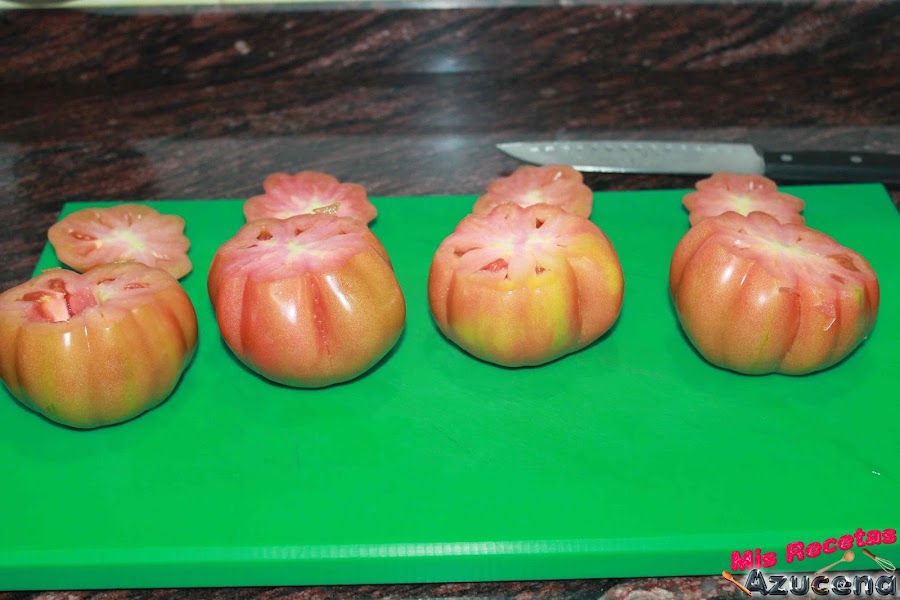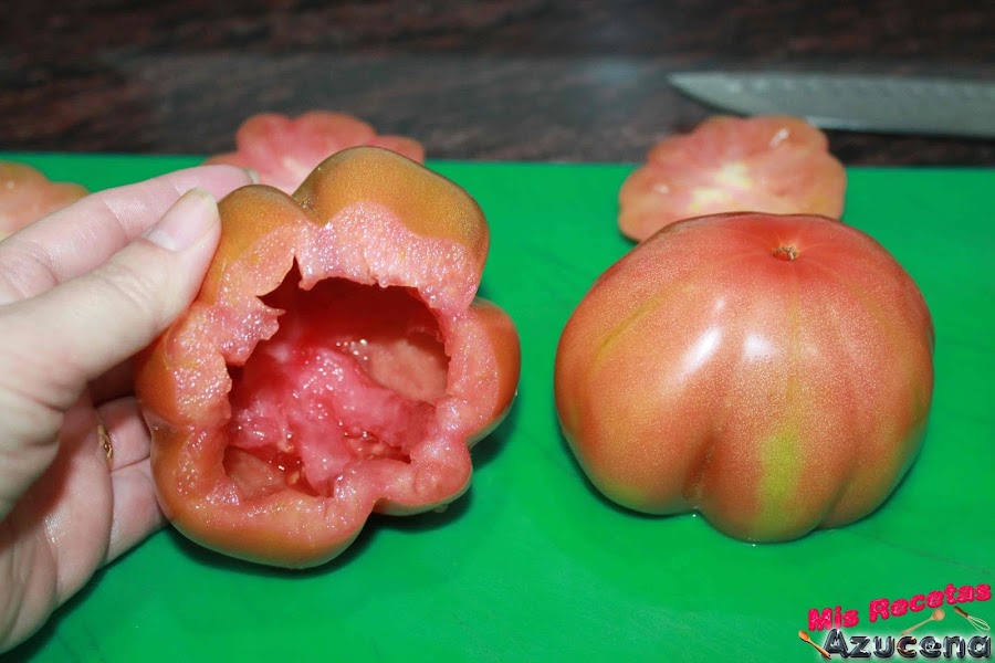 Ahora cogemos los tomates y les cortaremos la parte del culo y reservaremos la tapa para más adelante, con ayuda de un saca bolas o una cuchara le sacaremos todo la parte del interior del tomate, una vez los tengamos limpios los pondremos boca abajo para que suelten el agua que les pueda quedar dentro.