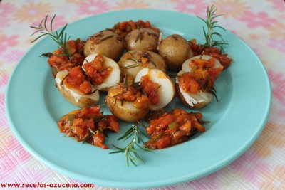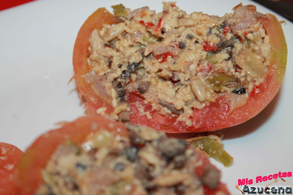 Pasados unos minutos por los tomates para que pierdan el agua, los cogeremos y los rellenaremos con el revuelto, cuando los tengamos todos rellenos los tapamos y los pondremos sobre una bandeja apta para horno, le pondremos un chorreón de aceite por encima y un poco de sal.
