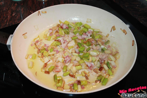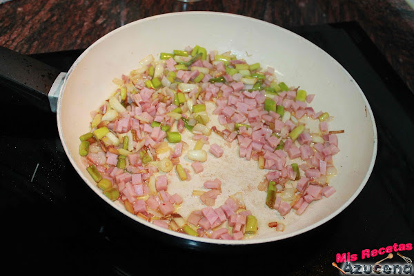 Una vez lo tengamos todo picado pondremos una sartén al fuego a fuego medio, cuando este caliente añadiremos un fondo de aceite, añadimos los ajetes, salpimentamos y los sofreiremos durante 3 minutos para poder añadir el beicon, removemos todo y volveremos a dejar durante otros 2 minutos más.