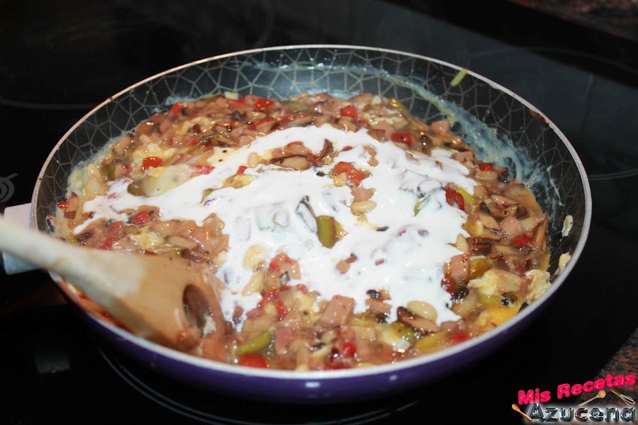 Cogemos un cuenco y cascaremos los huevos, lo batiremos un poco para poder añadirlos al sofrito, seguidamente añadiremos la nata (crema de leche) también, mezclamos todo, comprobaremos el punto de sal y dejaremos hasta que se nos cuaje, no nos tiene que quedar seco, lo que queremos es que nos quede más bien cremoso, una vez lo tengamos a nuestro gusto retiramos del fuego y reservamos.