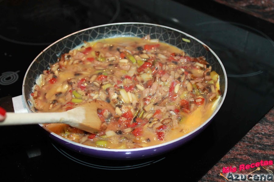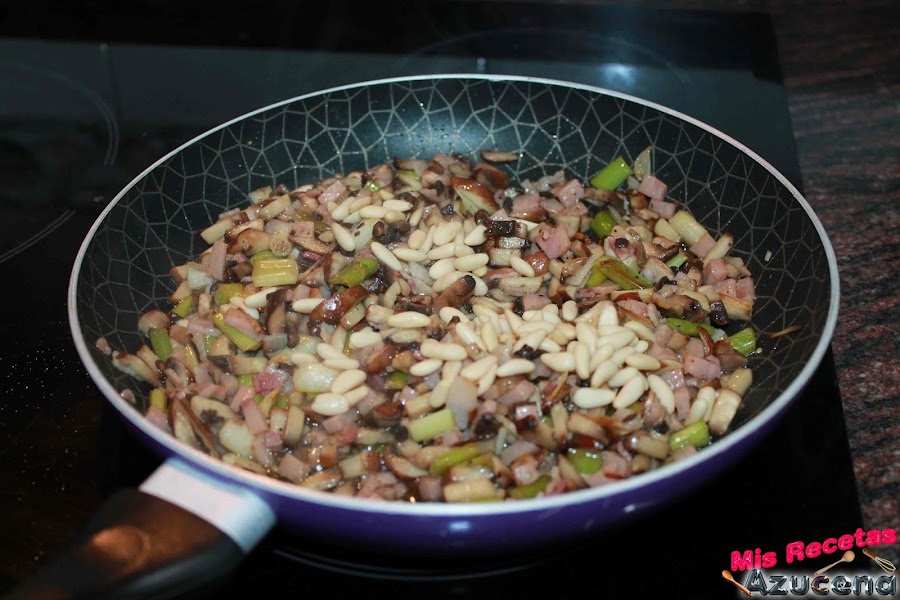 Una vez ser pierda el agua que soltaron las setas añadiremos los piñones, removemos todo y dejamos 3 minutos más, por ultimo añadiremos los pimientos asados, le damos unas vueltas.