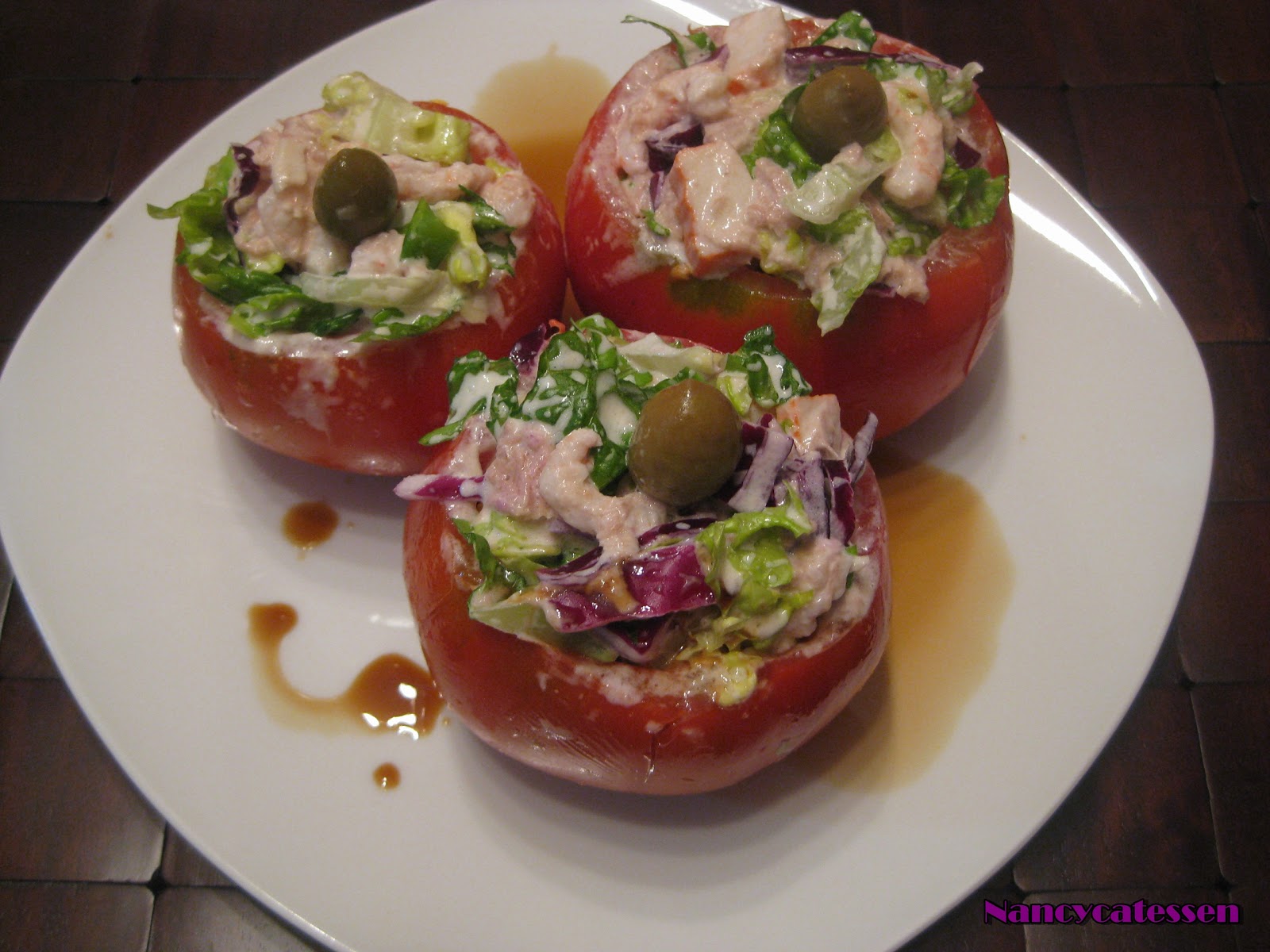 Pues eso....que ya no sé qué hacer con tanto tomate!Gazpacho, pisto, salsa de tomate...Y así, rellenos de ensalada, los suele hacer mi mami desde que yo recuerdo, porque en verano siempre hemos tenido muchas verduras...ella los rellena de ensaladilla rusa, pero yo los he querido hacer un poco más ligeros..pero sólo un poco,je,je...Queréis saber de qué los he rellenado??? Pues tendréis que seguir leyennnnnnnnnnnnnnnnnnnnnnnnnnndo....