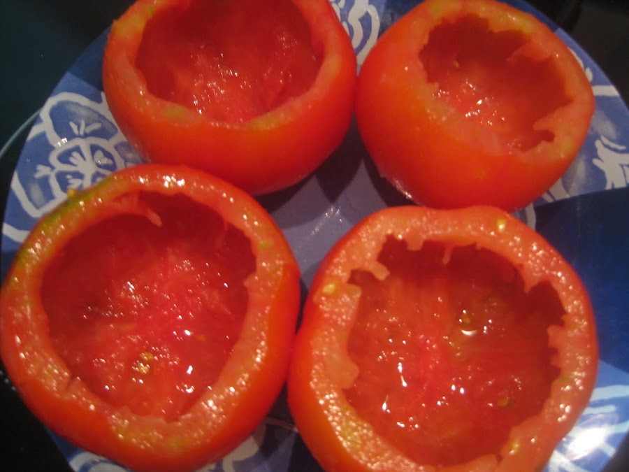 Les cortaremos la parte de arriba y los vaciaremos con un sacabolas y, si no tenéis ( como yo,ja,ja) pues con la ayuda de un cuchillo y una cuchara..Por supuesto, el relleno no lo tiramos ( Mi cultura del aprovechamiento,je,je)...podemos agrgarlo al relleno de la ensalada, o hacer tomate frito, o usarlo para hacer gazpacho...seguro que se os ocurren más usos..a que si??