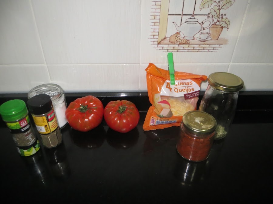 Lavamos, quitamos el culo a los tomates y los cortamos en rodajas gruesas. Las colocamos en una fuente y añadimos la sal, la pimienta, la albahaca y el orégano. Encima echáis un puñado de queso en cada uno de los tomates y coronáis con un poco de pimentón y un buen chorro de aceite.