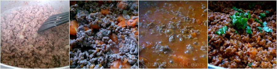 En una olla calentamos una cucharada de aceite, cocemos la cebolla bien picada y agregamos la carne molida, cocemos removiendo constantemente, así la carne nos quedará suelta. Salpimentamos al gusto y seguimos removiendo y presionando la carne hasta que esté totalmente cocida. Agregamos el tomate frito, el agua, la pulpa de tomate y una pizca de azúcar. Dejamos cocer tapado a fuego bajo, durante unos 30-40 minutos, hasta que reduzca la salsa. Añadimos por último el cilantro bien picado.