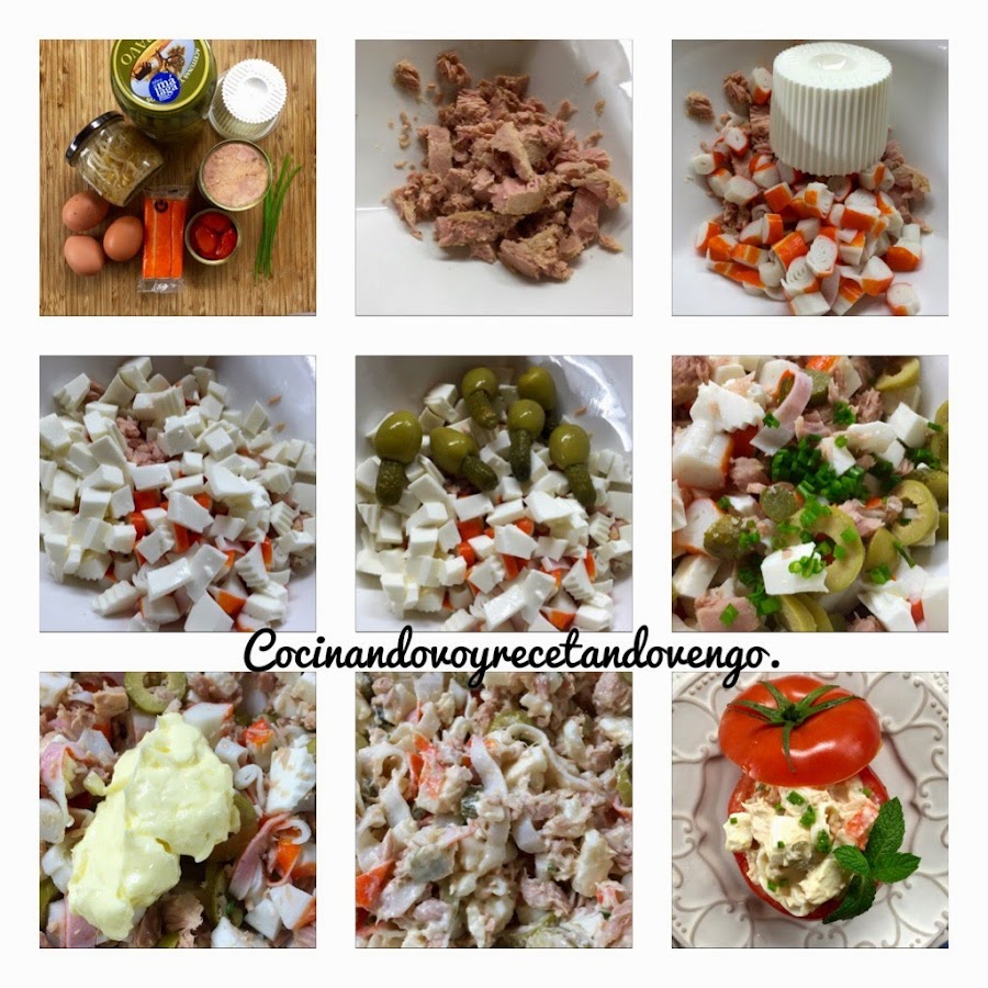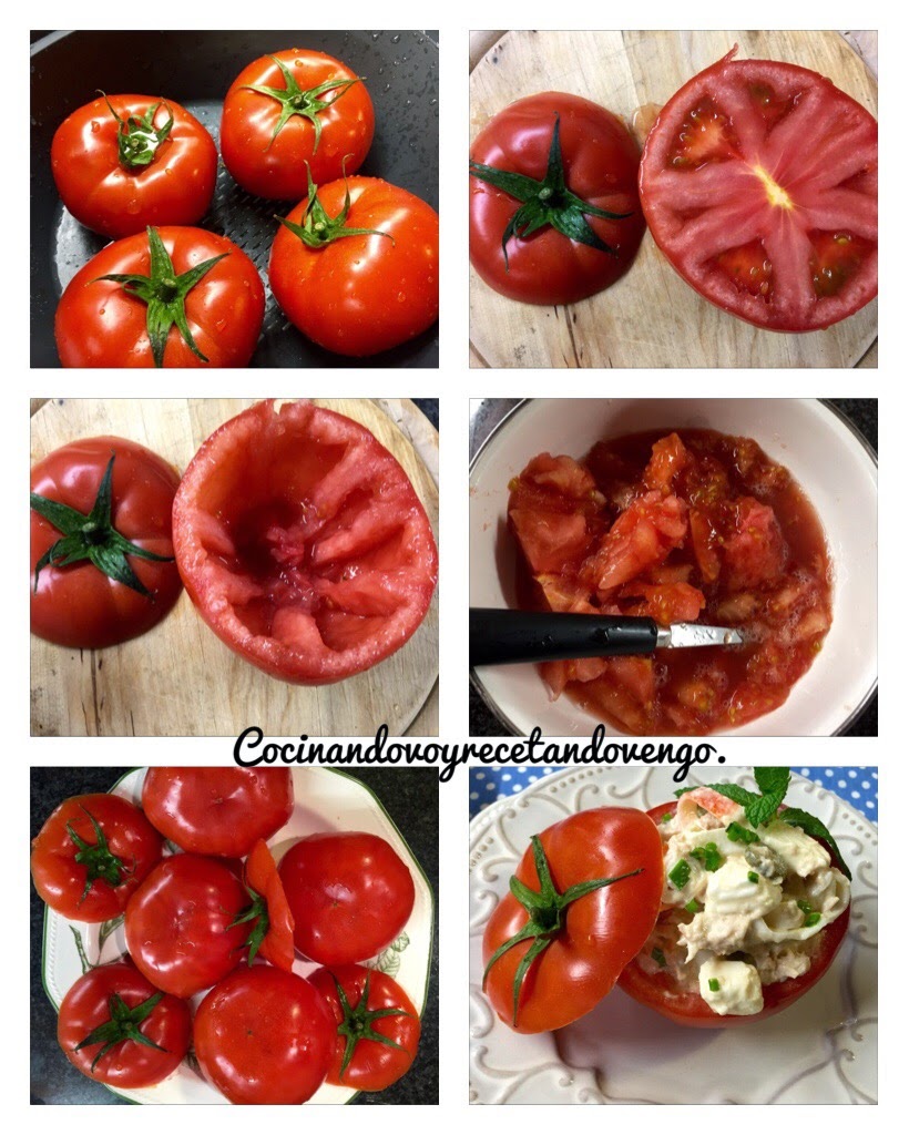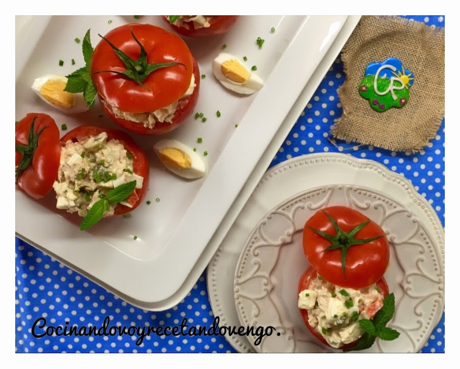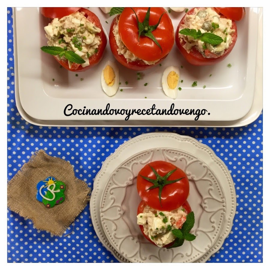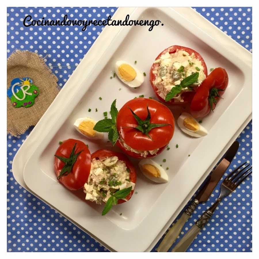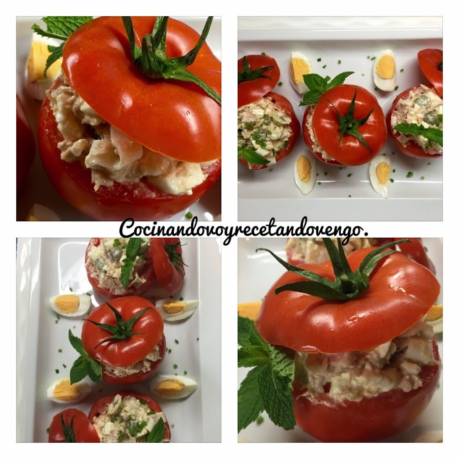 Hola a tod@s!! Hoy vamos a disfrutar con una receta que nos llena de verano, los tomates están en pleno esplendor desde julio a septiembre, por eso este plato lo asocio siempre con el buen tiempo...hoy en día tenemos tomates durante todo el año de alta calidad, pero es en su temporada cuando los conseguimos a mejor precio y un sabor y aroma inmejorable, así que esta receta que además es sencillisima de hacer y muy tradicional os la recomiendo para disfrutarlos. En verano este era uno de los platos estrella que igual lo disfrutas en la playa, como guarnición, sustituto de ensalada, primer plato en un almuerzo o cena ligera... cuando yo era pequeña lo más común era rellenarlos con ensaladilla rusa, luego en mi adolescencia se solían rellenaban con ensalada de arroz para variar y hoy día los hago "a mi manera", aligerándolos y rellenándolos sin arroz, ni patatas, transformándolo en un plato igual de delicioso que en mi casa nos encanta pero mucho más ligero para eliminar algunas calorías sin perder nada de sabor, si no los habéis probado, os invito a que los descubráis porque están ricos, riquísimos y seguro que os saca de más de un apuro porque suelen gustar a todos!! ;)