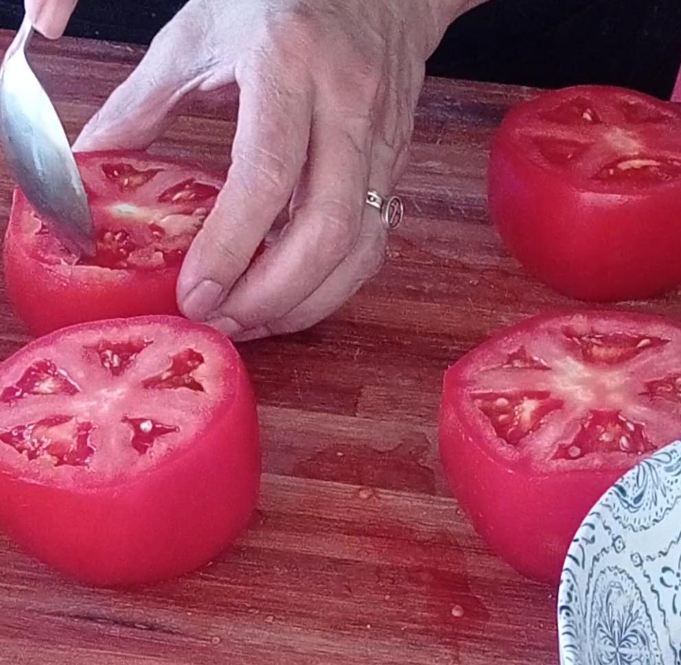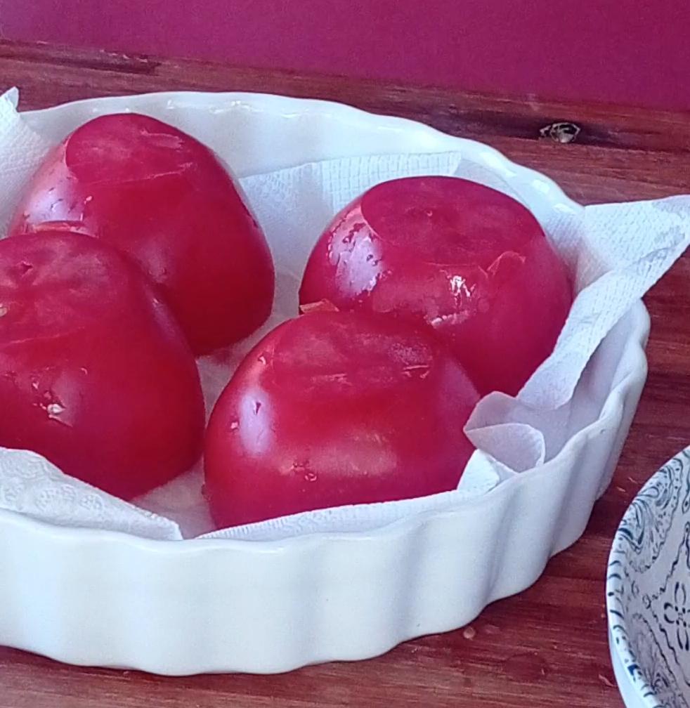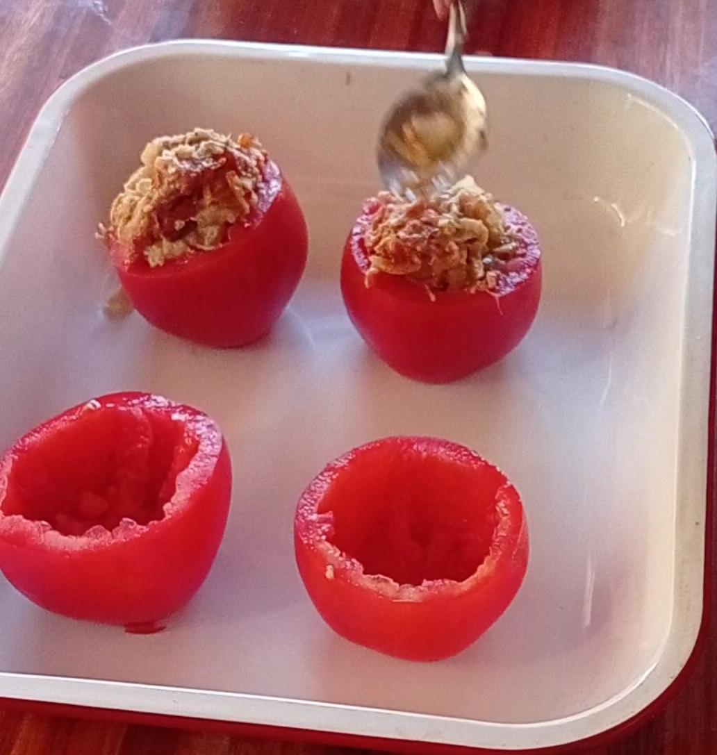 Precalentar el horno a 180 gradosCortar la parte superior de los tomates y reservar, con una cuchara quitar la pulpa y semillas a los tomates y ponerlo boca abajo con un papel absorbente y la pulpa reservar.