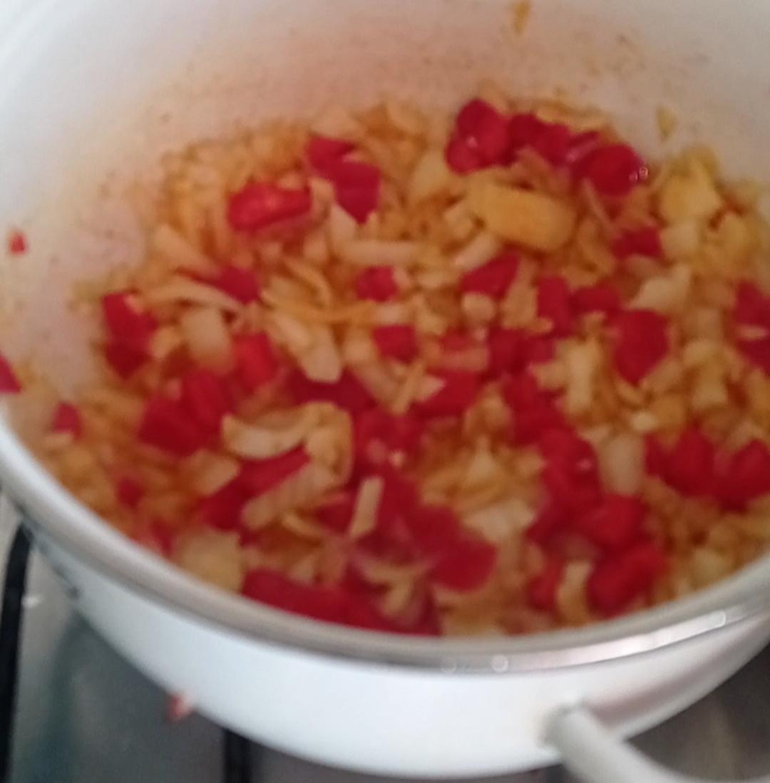 Picar la cebolla y el morrón y rehogar con un diente de ajo picado, reservar.