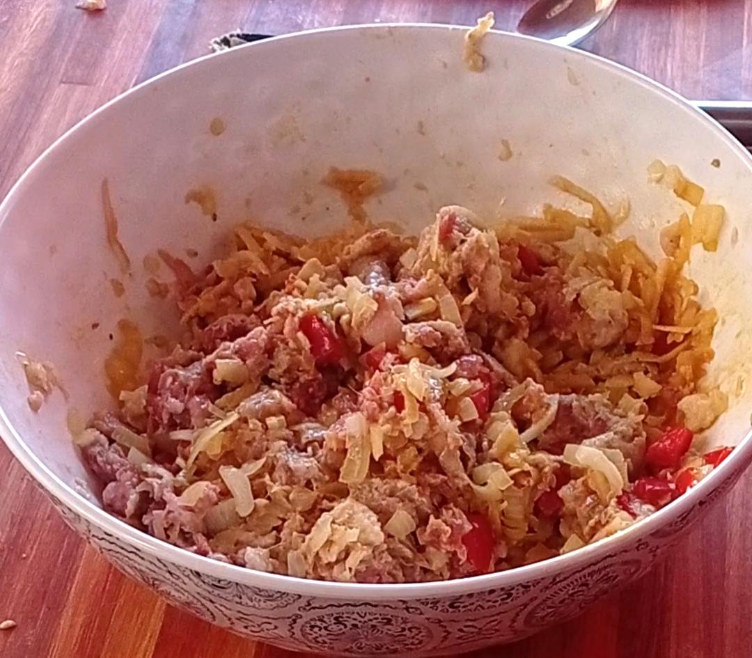 Esta receta es muy fácil de hacer y reemplacé la carne picada por chorizos que tenía en el freezer , para suavizar el sabor le agregué manzana rallada.
