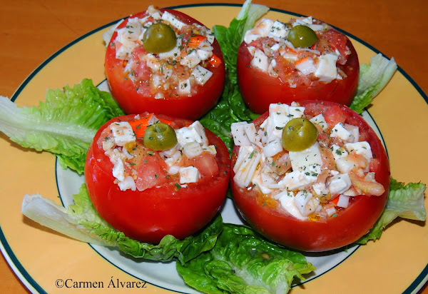 Con la mezcla se van rellenando los tomates y se adorna con media aceituna cada uno.