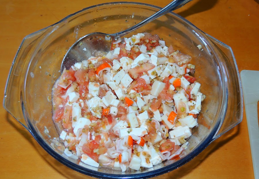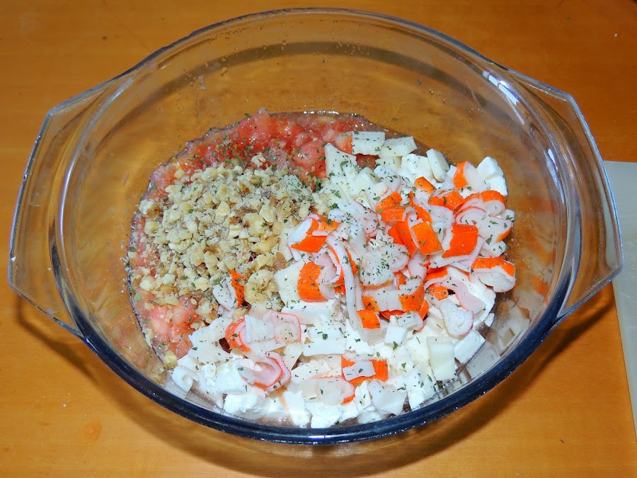 En un bol se pone la pulpa del tomate cortado en pequeños trozos y se le añaden los quesos también troceados, las nueces picadas, el surimi en daditos y el perejil. Se salpimienta.