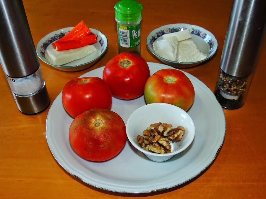 4 tomates gordos, 30 gr. de queso semi curado, 125 gr. de queso blanco, 20 gr. de nueces, una cucharadita de perejil picado, 3 palitos de surimi, sal, pimienta, aceite, unas hojas de lechuga y dos aceitunas rellenas para decorar.