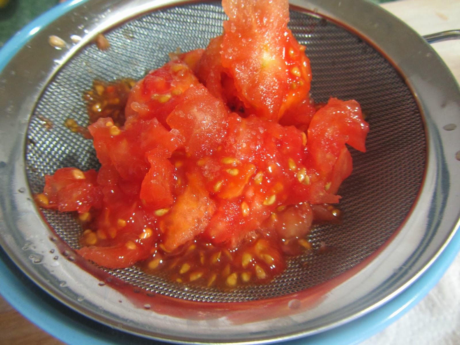 Reservamos también la pulpa, suprimiendo las partes más duras, y la ponemos a escurrir, con un poquito de sal, sobre un colador.